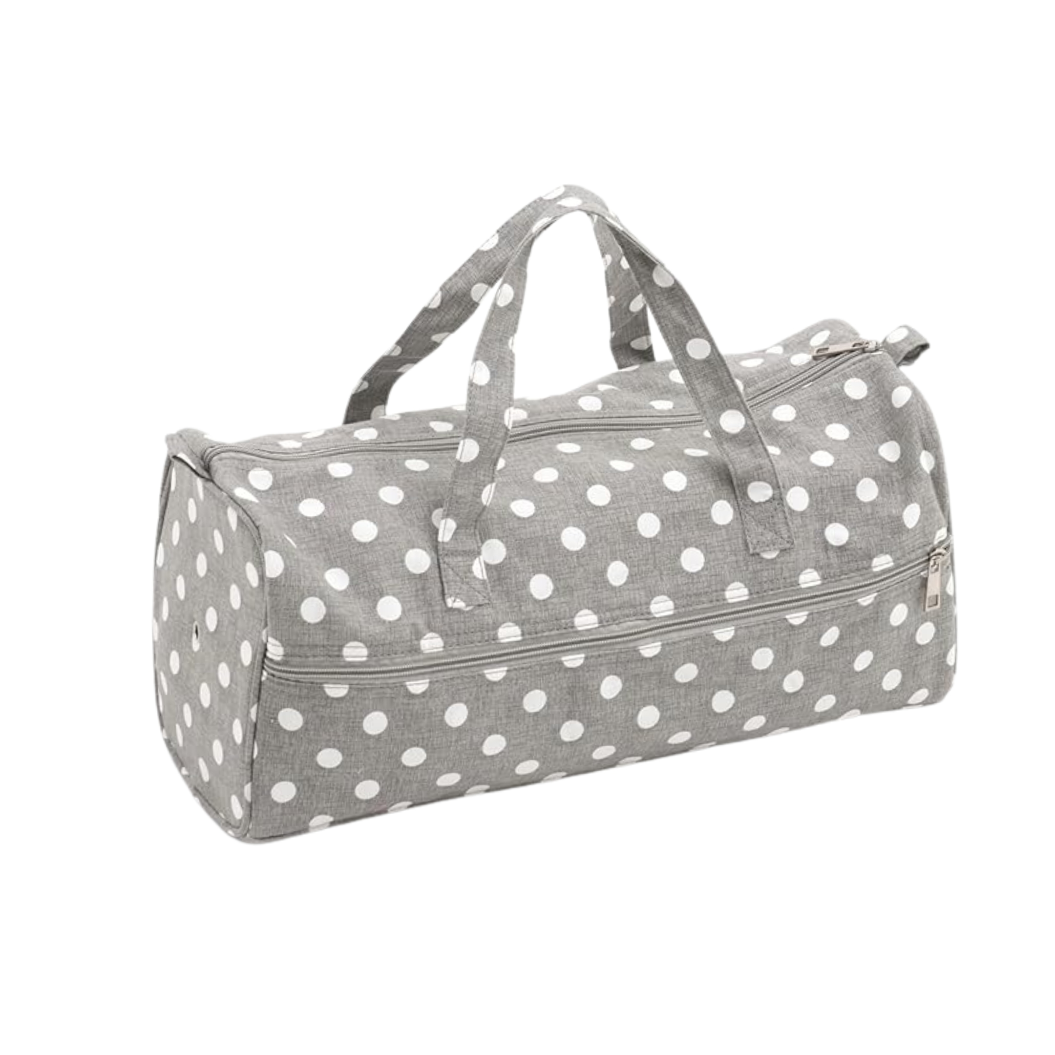 Laissez-vous séduire par ce grand sac à ouvrage, aussi joli que pratique, de la marque Hobby Gift ! Ce sac à fermeture zippée et à double poignée est fabriqué avec un tissu imperméable en Coton enduit de PVC mat avec un imprimé gris à pois blancs.